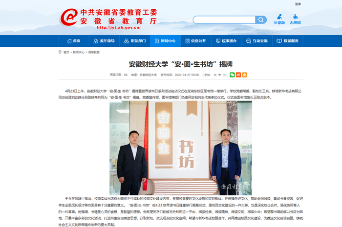 4月27日,安徽教育网以《乐竞在线注册“安·图·生书坊”揭牌》为题,报道我校安·图·生 书坊”揭牌暨世界读书日系列活动启动仪式于4月23日在龙湖东校区图书馆一楼举行。