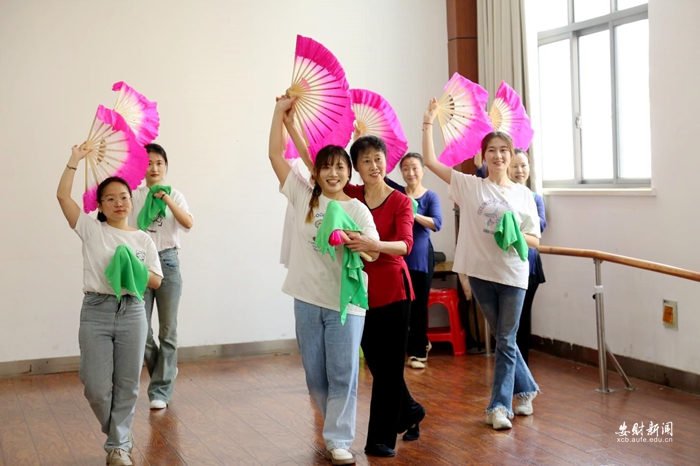 文化馆非遗保护中心负责人刘娜向参加研学的师生代表表示热烈欢迎。她表示,龙子湖区文化馆获评国家一级文化馆,文化馆一向重视推广中华优秀传统文化,希望留学生们通过此次研学活动能够更好地了解蚌埠非遗文化。在活动中,花鼓灯市级传承人刘和菊老师介绍了花鼓灯的起源和发展历史,现场传授了花鼓灯扇子手绢的握法、扇花步伐和兰花的基本姿态,并带领文化馆学员为大家表演了花鼓灯的经典曲目,精彩的表演赢得了现场观众的热烈掌声。