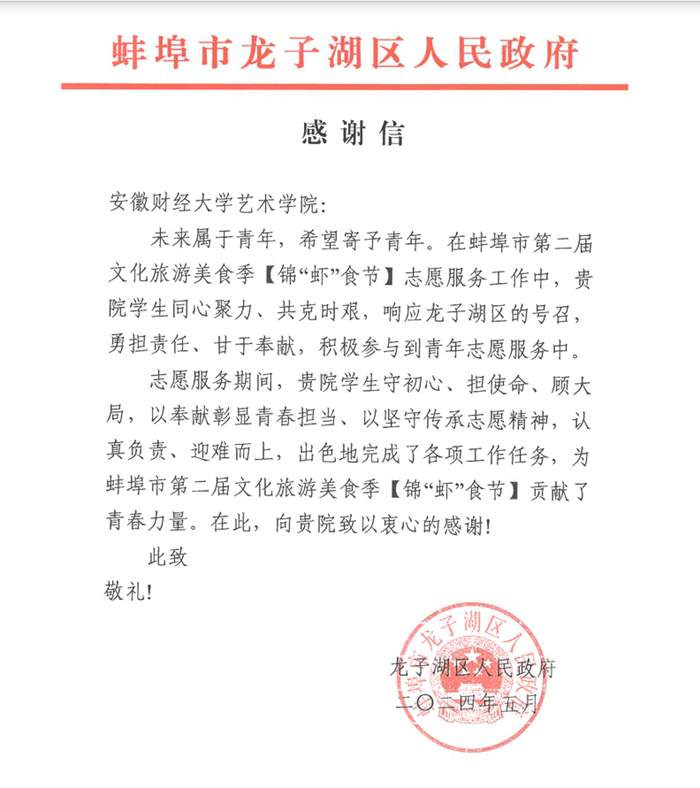 近日,龙子湖区人民政府向艺术学院发来感谢信,对艺术学院青年学生在蚌埠市第二届文化旅游美食季【锦“虾”食节】志愿服务工作表示感谢。