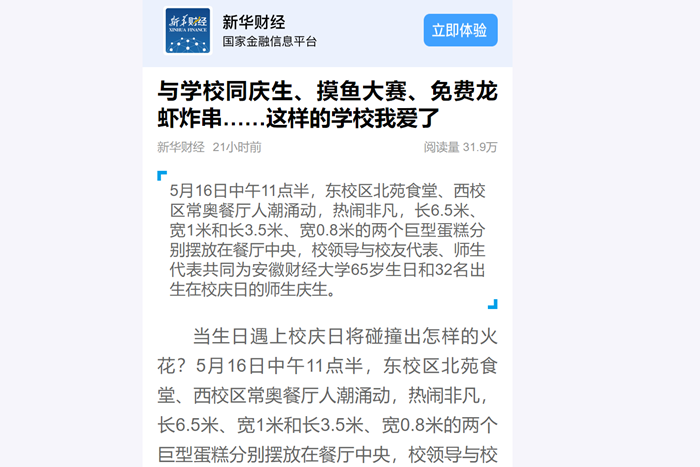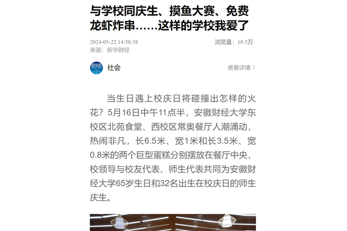 5月22日,新华社客户端、新华财经以《与学校同庆生、摸鱼大赛、免费龙虾炸串……这样的学校我爱了》为题,报道我校在校庆当天举办的一系列精彩活动,既走心又暖心,同学们纷纷表示“这样的学校我爱了”。