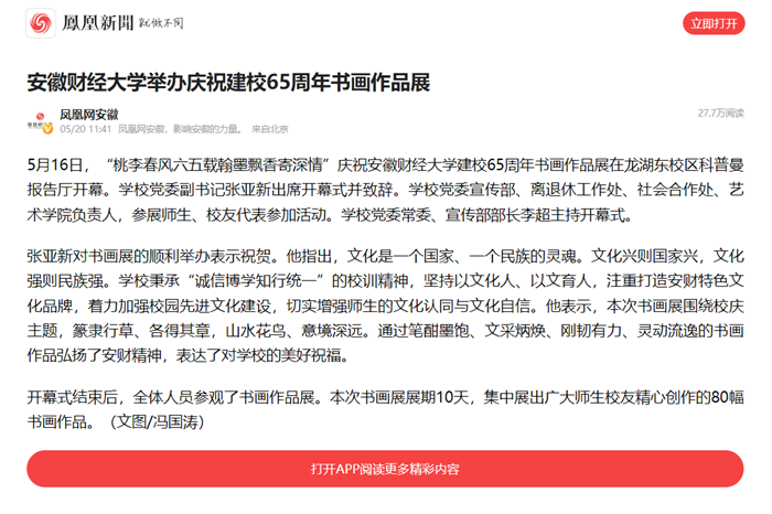 5月20日,凤凰网以《乐竞在线注册举办庆祝建校65周年书画作品展》为题,报道“桃李春风六五载 翰墨飘香寄深情”庆祝我校建校65周年书画作品展于5月16日在龙湖东校区科普曼报告厅开幕,本次书画展展期10天,集中展出广大师生校友精心创作的80幅书画作品。