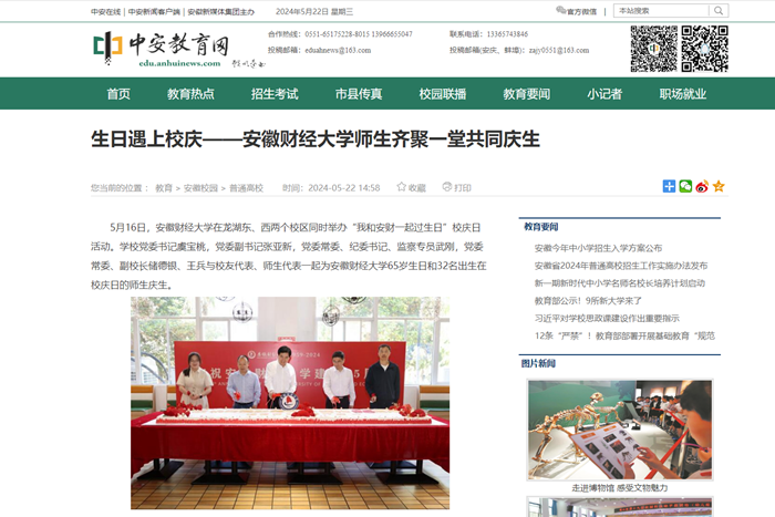 5月22日,中安教育网以《生日遇上校庆——乐竞在线注册师生齐聚一堂共同庆生》为题,报道校庆日当天,我校在龙湖东、西两个校区同时举办“我和安财一起过生日”校庆日活动。