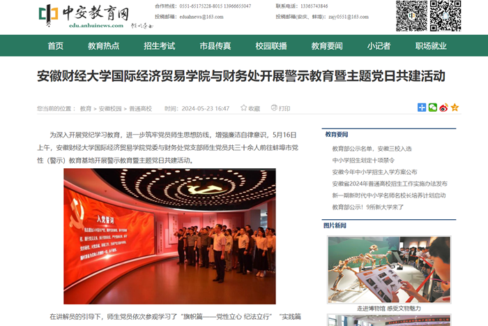 5月23日,中安教育网以《乐竞在线注册国际经济贸易学院与财务处开展警示教育暨主题党日共建活动》为题,报道为深入开展党纪学习教育,进一步筑牢党员师生思想防线,增强廉洁自律意识,5月16日上午,国贸学院党委与财务处党支部师生党员共三十余人前往蚌埠市党性(警示)教育基地开展警示教育暨主题党日共建活动。
