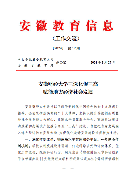 5月27日,《安徽教育信息》2024年第12期以《乐竞在线注册三深化促三高 赋能地方经济社会发展》为题,从“深化体制改革,锻造高水平智库服务平台”“深化品牌建设,打造高质量决策咨询成果”“深化合作共建,筑造高层次产教融合高地”三个方面报道我校积极服务区域经济社会发展取得的成效。