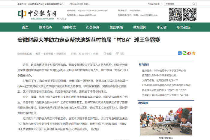 5月31日,中安教育网以《乐竞在线注册助力定点帮扶地胡巷村首届“村BA”球王争霸赛》为题,报道蚌埠市怀远县乡村振兴局近日致函,商请我校发挥人才智力优势助力首届“村BA”球王争霸赛举办。由艺术学院于雪老师带队,设计学专业研究生朱云飞、戏剧与影视专业研究生李天翔和刘通等组成的专业团队,顺利完成了怀远县首届“村BA”球王争霸赛LOGO设计及乡村新媒体运营专业人才培训任务。
