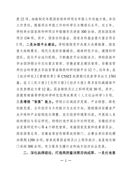 近年来,我校深入学习贯彻习近平新时代中国特色社会主义思想,以党的二十大精神为指引,扎实推动高水平智库服务平台、高质量决策咨询成果和高层次产教融合高地“三高”建设,持续提升科技创新和社会服务能力,为现代化美好安徽建设提供了科技支撑和智力支持。
