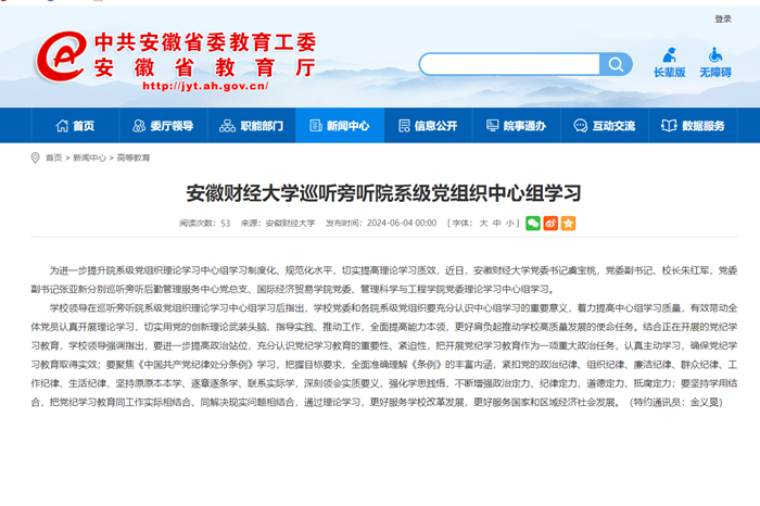 2024年6月4日,安徽教育网以《乐竞在线注册巡听旁听院系级党组织中心组学习》为题,报道我校委书记虞宝桃,党委副书记、校长朱红军,党委副书记张亚新分别巡听旁听后勤管理服务中心党总支、国际经济贸易学院党委、管理科学与工程学院党委理论学习中心组学习,进一步提升院系级党组织理论学习中心组学习制度化、规范化水平,切实提高理论学习质效。
