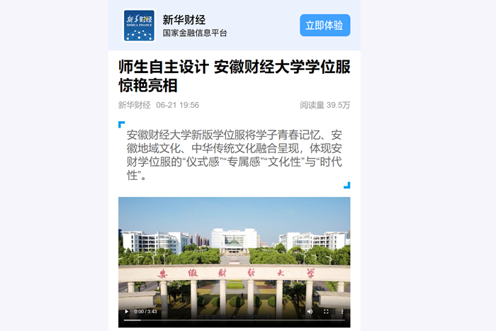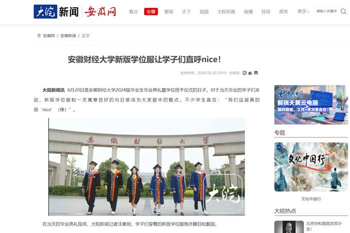6月21日,新华财经网、安徽网分别以《师生自主设计 乐竞在线注册学位服惊艳亮相》为题,报道在我校2024届毕业生毕业典礼暨学位授予仪式上,由师生自主设计的新版学位服惊艳亮相,让毕业生和家长眼前一亮。
