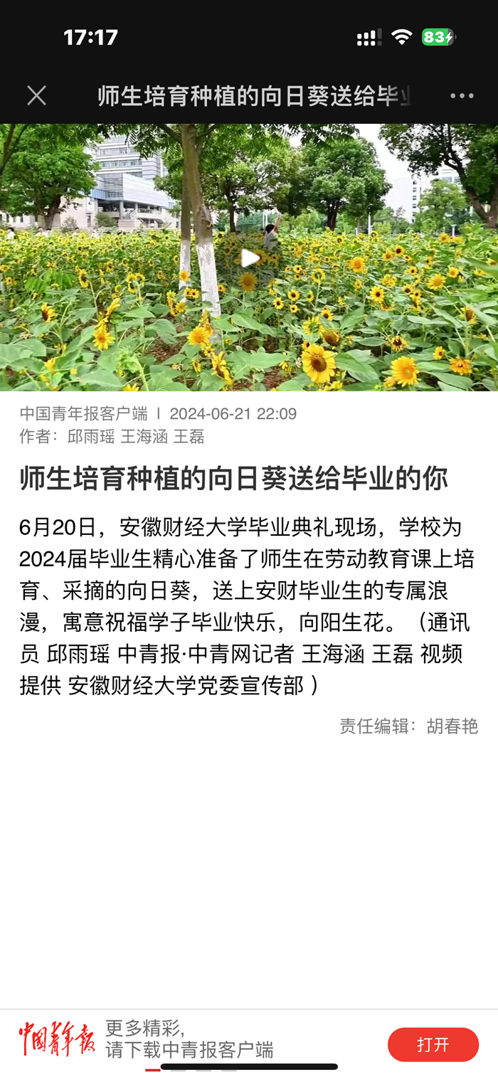 6月20日,中国青年报客户端以《师生培育种植的向日葵送给毕业的你》为题,报道在6月20日举行的毕业典礼现场,学校为2024届毕业生精心准备了师生在劳动教育课上培育、采摘的向日葵,送上安财毕业生的专属浪漫,寓意祝福学子毕业快乐,向阳生花。