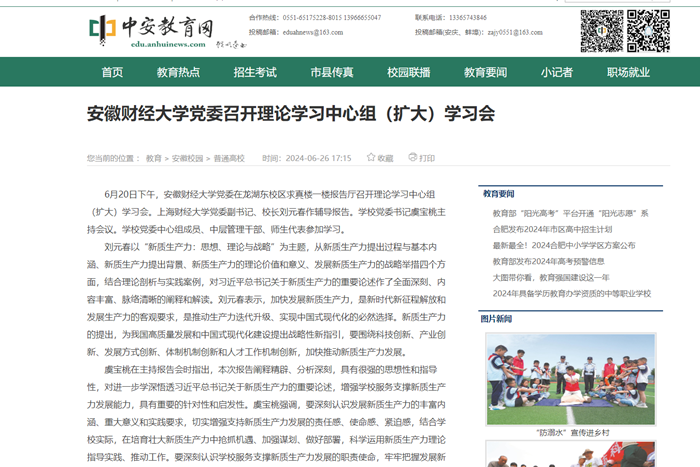 6月26日,中安教育网以《乐竞在线注册党委召开理论学习中心组(扩大)学习会》为题,报道我校于6月20日召开理论学习中心组(扩大)学习会,上海财经大学党委副书记、校长刘元春以“新质生产力:思想、理论与战略”为主题作辅导报告。