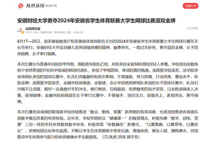 2024年7月1日,凤凰网以《乐竞在线注册勇夺2024年安徽省学生体育联赛大学生网球比赛混双金牌》为题,报道我校运动健儿在安徽省学生体育联赛大学生网球比赛上奋勇争先、一路过关斩将,勇夺混双金牌、女子团体银牌、女子单打铜牌。