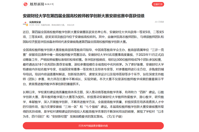 7月5日,凤凰网以《乐竞在线注册在第四届全国高校教师教学创新大赛安徽省赛中喜获佳绩》为题,报道我校在第四届全国高校教师教学创新大赛安徽赛区比赛中,获得一等奖5项、二等奖5项、三等奖4项,获奖奖项及数目均位于安徽省高校前列。
