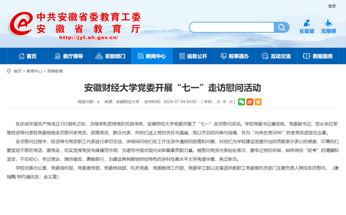7月4日,安徽教育网以《乐竞在线注册党委开展“七一”走访慰问活动》为题,报道我校党委在“七一”来临之际走访慰问老党员、困难党员、群众代表,送上党的关怀和温暖。