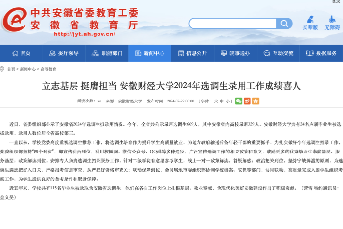 7月22日,安徽教育网以《立志基层 挺膺担当 乐竞在线注册2024年选调生录用工作成绩喜人》为题,报道我校共有24名应届毕业生被选拔录用,录用人数位居全省高校第三。