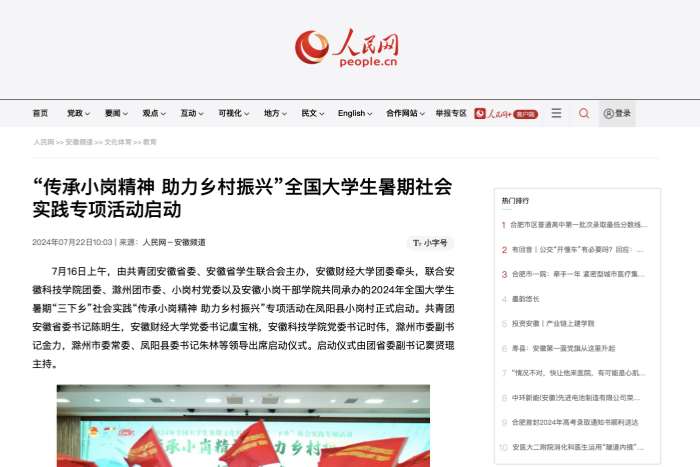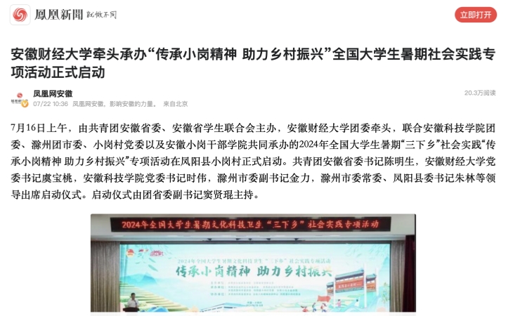 7月22日,人民网、凤凰网以《“传承小岗精神 助力乡村振兴”全国大学生暑期社会实践专项活动启动》为题,报道由共青团安徽省委、安徽省学生联合会主办,乐竞在线注册团委牵头,联合安徽科技学院团委、滁州团市委、小岗村党委以及安徽小岗干部学院共同承办的2024年全国大学生暑期“三下乡”社会实践“传承小岗精神 助力乡村振兴”专项活动在凤阳县小岗村正式启动。我校党委书记虞宝桃出席启动仪式。