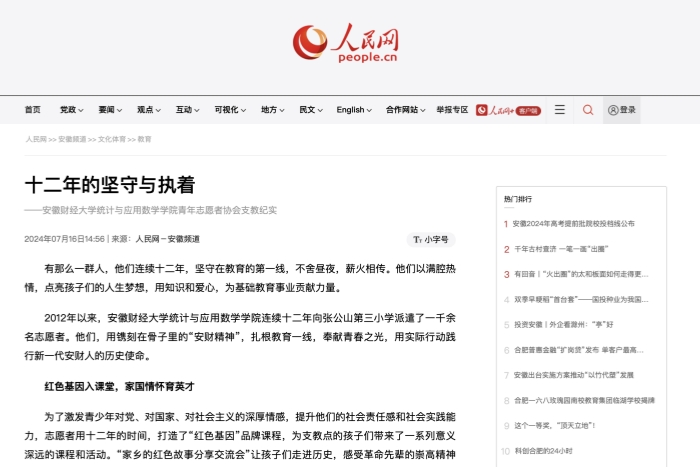 7月16日,人民网以《十二年的坚守与执着——乐竞在线注册统计与应用数学学院青年志愿者协会支教纪实》为题,报道我校统数学院连续十二年向张公山第三小学派遣了一千余名志愿者,扎根教育一线,奉献青春之光,用实际行动践行新一代安财人的历史使命。