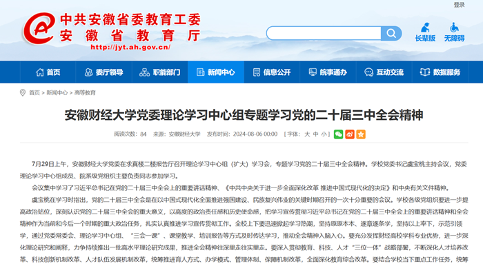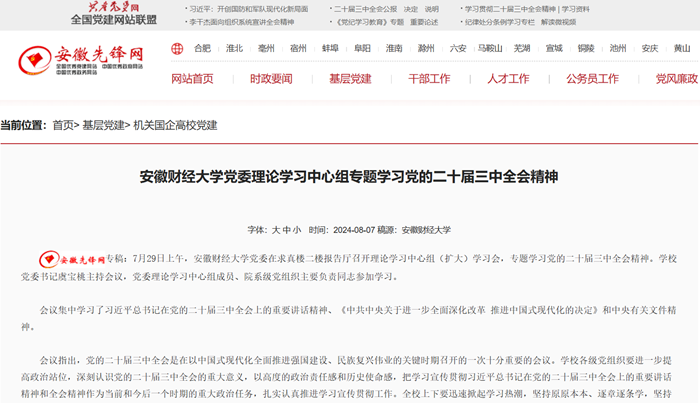 8月6日,安徽先锋网、安徽教育网以《乐竞在线注册党委理论学习中心组专题学习党的二十届三中全会精神》为题,报道我校党委在求真楼二楼报告厅召开理论学习中心组(扩大)学习会,专题学习党的二十届三中全会精神。