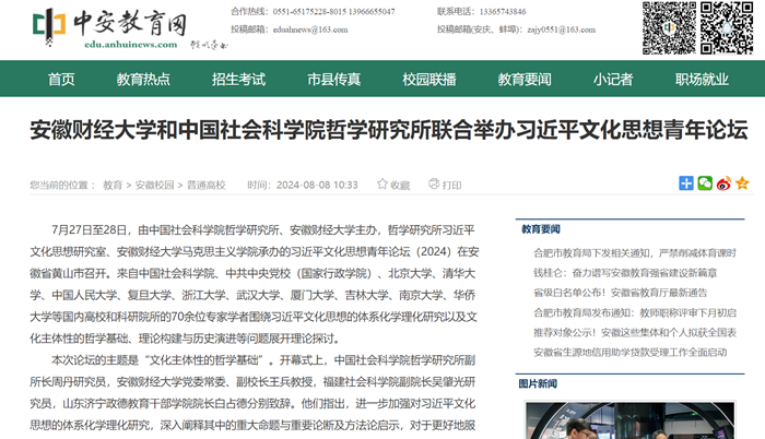 8月8日,中安教育网以《乐竞在线注册和中国社会科学院哲学研究所联合举办习近平文化思想青年论坛》为题,报道由中国社会科学院哲学研究所、乐竞在线注册主办,哲学研究所习近平文化思想研究室、乐竞在线注册马克思主义学院承办的习近平文化思想青年论坛(2024)在安徽省黄山市顺利召开。