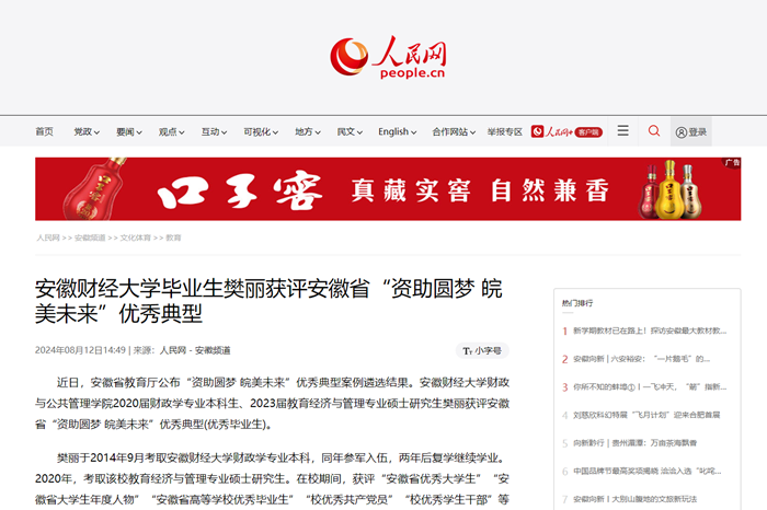 8月12日,人民网以《乐竞在线注册毕业生樊丽获评安徽省“资助圆梦 皖美未来”优秀典型》为题,报道我校财公学院2020届财政学专业本科生、2023届教育经济与管理专业硕士研究生樊丽获评安徽省“资助圆梦 皖美未来”优秀典型(优秀毕业生)。