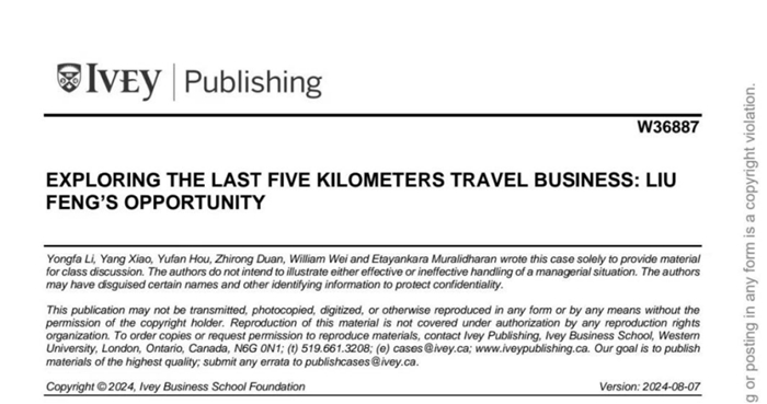 8月7日,工商管理学院李永发教授团队撰写的英文案例《EXPLORING THE LAST FIVE KILOMETERS TRAVEL BUSINESS: LIU FENG’S OPPORTUNITY》(案例编号:W36887)由国际著名案例机构——毅伟案例库(Ivey Publishing)正式收录并作全球出版发行。毅伟案例库是由加拿大韦仕敦大学(Western University)毅伟商学院(Ivey Business School)建立的国际著名案例库,与哈佛案例库、欧洲案例库并称为“国际三大商业案例库”,其案例被全球各大商学院购买并广泛使用。