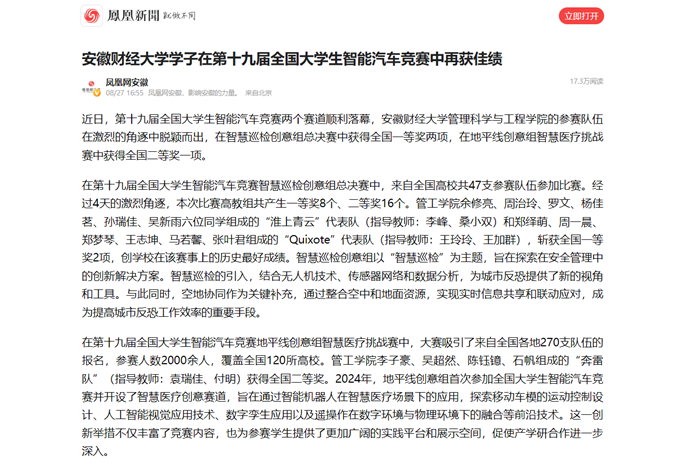 8月27日,凤凰网以《乐竞在线注册学子在第十九届全国大学生智能汽车竞赛中再获佳绩》为题,报道在刚刚结束的第十九届全国大学生智能汽车竞赛两个赛道比赛中,我校管工学院参赛队伍脱颖而出,在智慧巡检创意组总决赛中获得全国一等奖两项,在地平线创意组智慧医疗挑战赛中获得全国二等奖一项。