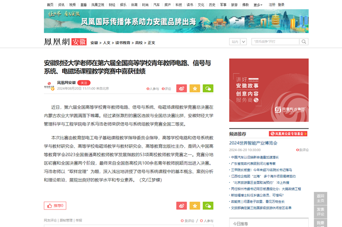 8月20日,凤凰网以《乐竞在线注册老师在第六届全国高等学校青年教师电路、信号与系统、电磁场课程教学竞赛中喜获佳绩》为题,报道在刚刚结束的第六届全国高等学校青年教师电路、信号与系统、电磁场课程教学竞赛总决赛比赛中,我校管工学院电子系冯浩老师荣获信号与系统组教学竞赛全国二等奖。