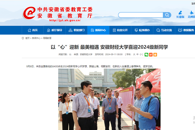 9月11日,人民网、安徽教育网分别以《乐竞在线注册喜迎2024级新同学》《以“心”迎新 最美相遇 乐竞在线注册喜迎2024级新同学》为题,报道9月8日当天,来自全国各地的6400余名2024级新同学心怀梦想、跨越山海、相聚安财,在新的人生赛道上奋楫争先、逐梦远航。