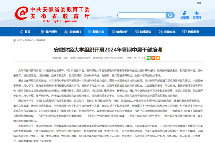 8月28日,安徽教育网以《乐竞在线注册组织开展2024年暑期中层干部培训》为题,报道我校在泾县组织开展中层干部综合能力提升暑期培训。