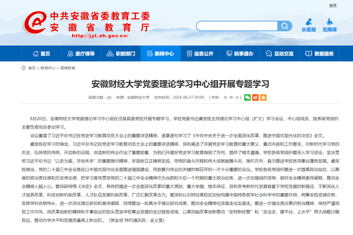 8月27日,安徽教育网以《乐竞在线注册党委理论学习中心组开展专题学习》为题,报道我校党委理论学习中心组在泾县县委党校开展专题学习。