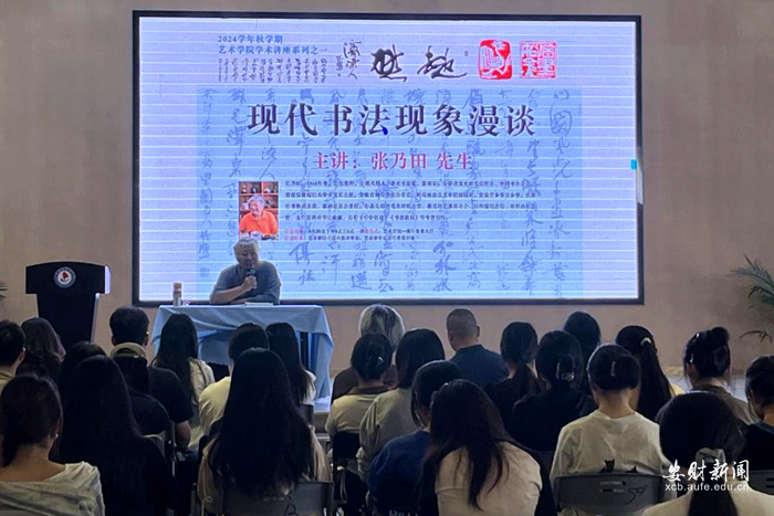2024年9月25日下午,艺术学院邀请著名书法篆刻家张乃田在艺术楼科普曼多功能厅举办“现代书法现象漫谈”学术讲座。艺术学院部分教师,书法与美术专业、艺术学专业硕士研究生聆听了讲座。讲座由艺术学院副院长杨德忠主持。