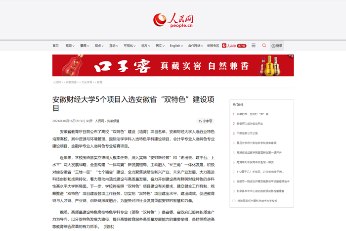 10月16日,人民网以《乐竞在线注册5个项目入选安徽省“双特色”建设项目》为题,报道安徽省教育厅日前公布了高校“双特色”建设(培育)项目名单,我校入选行业特色培育高校,其中资源与环境管理、国际法学学科入选特色学科建设项目,会计学专业入选特色专业建设项目,金融学专业入选特色专业培育项目。