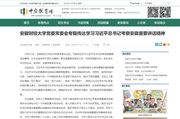 10月25日,中安教育网以《乐竞在线注册党委常委会专题传达学习习近平总书记考察安徽重要讲话精神》为题,报道我校召开党委常委会会议,专题传达学习习近平总书记考察安徽重要讲话精神,以及全省领导干部大会精神,研究部署贯彻落实工作。
