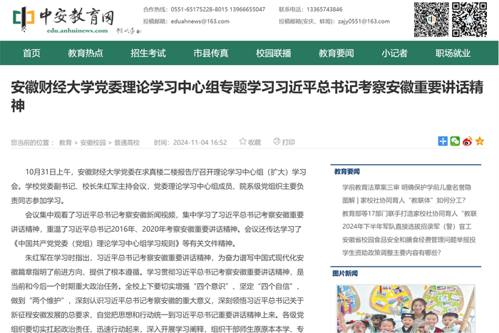 11月4日,中安教育网以《乐竞在线注册党委理论学习中心组专题学习习近平总书记考察安徽重要讲话精神》为题,报道10月31日上午,我校党委在求真楼二楼报告厅召开理论学习中心组(扩大)学习会。