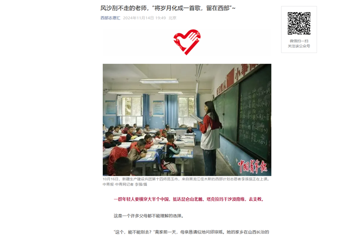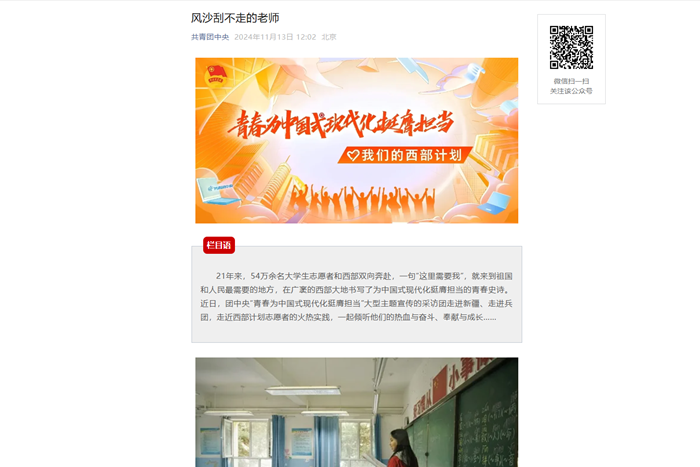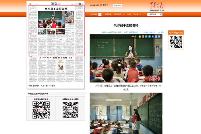 11月13日,《中国青年报》05版以《风沙刮不走的老师》为题,报道了我校第26届研究生支教团成员、金融学院李添琪同学赴新疆昆玉市皮山农场支教的感人故事。
