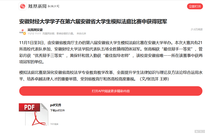 11月12日,凤凰网以《乐竞在线注册学子在第六届安徽省大学生模拟法庭比赛中获得冠军》为题,报道在第六届安徽省大学生模拟法庭比赛中,我校法学院代表队五场全胜摘得团体冠军。张雨桐获“最佳辩手一等奖”,管彩月获“优秀辩手三等奖”,黄保轩和晋入勤获“最佳指导老师”,我校是安徽省唯一一所在该赛事中获两项冠军的单位。