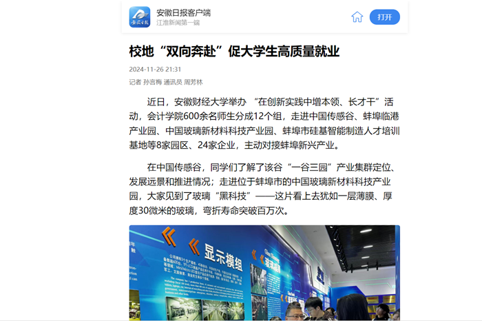 11月25-26日,安徽日报客户端、蚌埠日报、蚌埠电视台分别以《校地“双向奔赴”促大学生高质量就业》《乐竞在线注册“在创新实践中增本领、长才干”活动走进蚌埠企业 校地“双向奔赴”促高质量就业》《开展“访企拓岗促就业”专项行动推进产教融合走深走实》为题,报道我校会计学院聚焦校地合作共赢共建,近日组织600余名师生走进蚌埠市硅基智能制造人才培训基地等8家园区、24家企业,主动对接蚌埠新兴产业,为蚌埠高质量发展提供人才资源和智力服务。