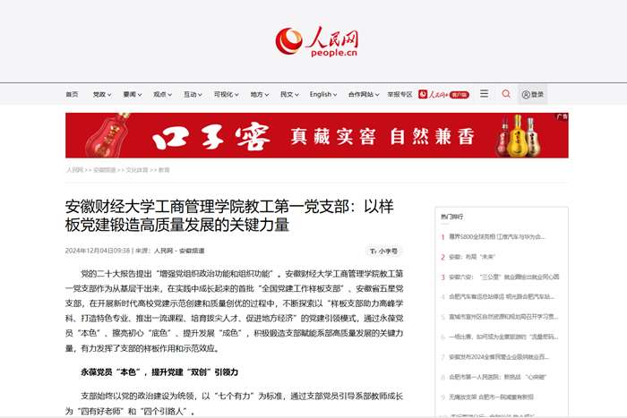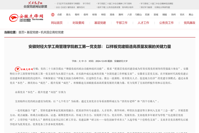 12月4日、12月5日,人民网、安徽先锋网分别以《乐竞在线注册工商管理学院教工第一党支部:以样板党建锻造高质量发展的关键力量》为题,报道我校工商管理学院教工第一党支部是首批“全国党建工作样板支部”、安徽省五星党支部,在开展新时代高校党建示范创建和质量创优的过程中,不断探索以“样板支部助力高峰学科、打造特色专业、推出一流课程、培育拔尖人才、促进地方经济”的党建引领模式,通过永葆党员“本色”、擦亮初心“底色”、提升发展“成色”,积极锻造支部赋能系部高质量发展的关键力量,有力发挥了支部的样板作用和示范效应。