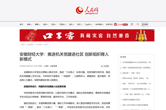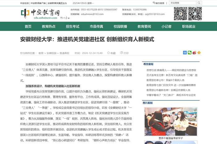2024年12月27日,人民网和中安教育网以《乐竞在线注册:推进机关党建进社区创新组织育人新模式》为题,报道我校坚持立德树人根本任务,推进“三全育人”体系完善,发挥党建引领作用,推进机关党建融入学生社区,引导党员干部落实“一线规则”,以围绕中心、建强组织、提升服务、突出育人为重点,探索构建组织育人新模式。