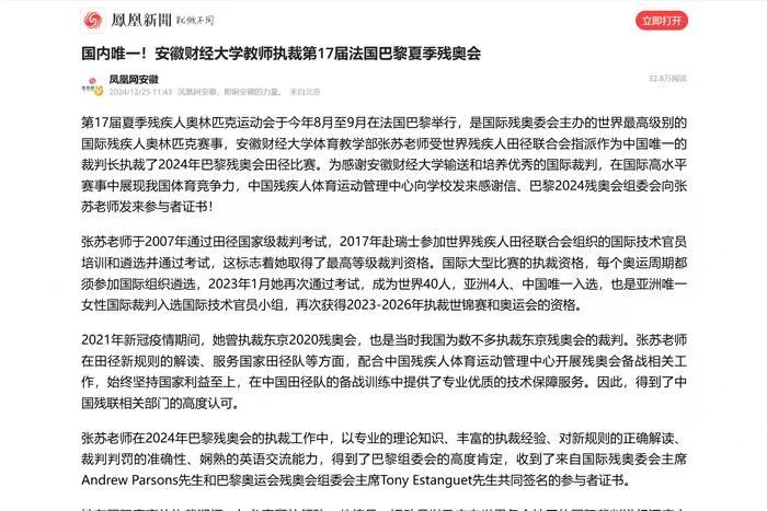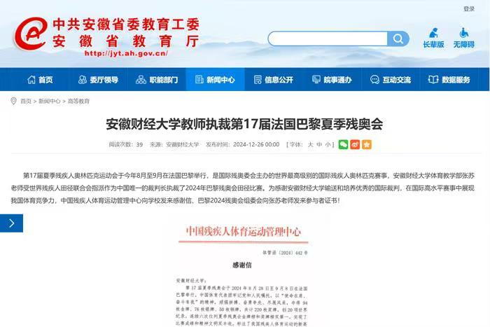 12月26日,凤凰网、安徽教育网分别以《国内唯一!乐竞在线注册教师执裁第17届法国巴黎夏季残奥会》《乐竞在线注册教师执裁第17届法国巴黎夏季残奥会》为题,报道我校体育教学部张苏老师受世界残疾人田径联合会指派作为中国唯一的裁判长执裁了2024年巴黎残奥会田径比赛。