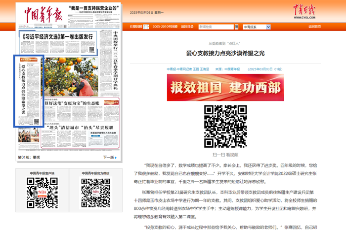 3月3日,《中国青年报》01版刊发《从受助者到“点灯人” 爱心支教接力点亮沙漠希望之光》文章,报道我校会计学院张骞、张雅馨、方滢滢等学生志愿者走进沙漠支教的动人故事,实现了从受助者到“点灯人”的转变。截至目前,我校先后派出5届支教团、15名志愿者赴新疆生产建设兵团第十四师昆玉市皮山农场中学开展爱心支教活动。现将全文转载如下: