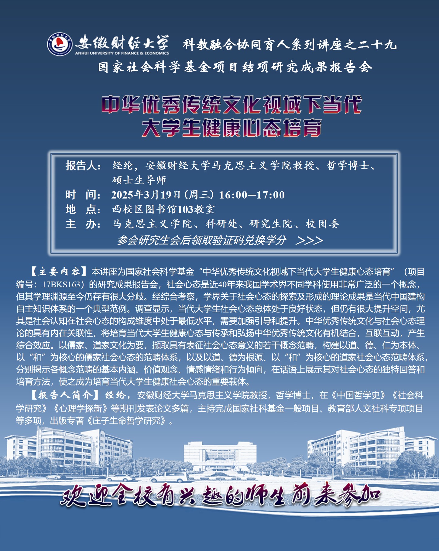 2025年3月19日:【科教融合协同育人系列讲座之二十九】中华优秀传统文化视域下当代大学生健康心态培育