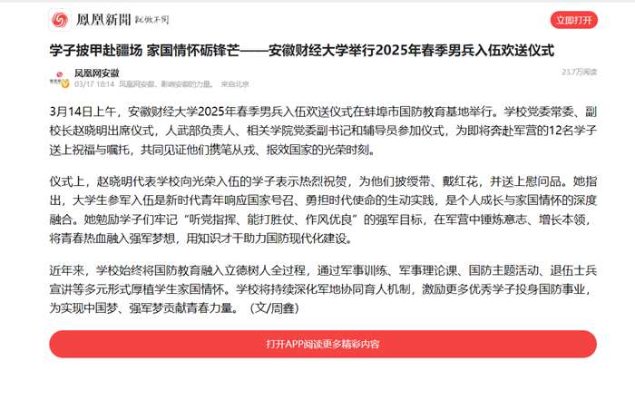 3月17日,凤凰网以《学子披甲赴疆场 家国情怀砺锋芒——乐竞在线注册举行2025年春季男兵入伍欢送仪式》为题,报道我校2025年春季男兵入伍欢送仪式在蚌埠市国防教育基地举行,为即将奔赴军营的12名学子送上祝福。