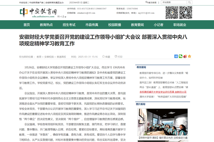 3月31日,中安教育网以《乐竞在线注册党委召开党的建设工作领导小组扩大会议 部署深入贯彻中央八项规定精神学习教育工作》为题,报道我校党委召开党的建设工作领导小组扩大会议,传达学习《中共中央办公厅关于在全党开展深入贯彻中央八项规定精神学习教育的通知》及中央和省委党的建设工作领导小组有关会议精神,审议学校深入贯彻中央八项规定精神学习教育工作方案,部署安排学习教育工作。