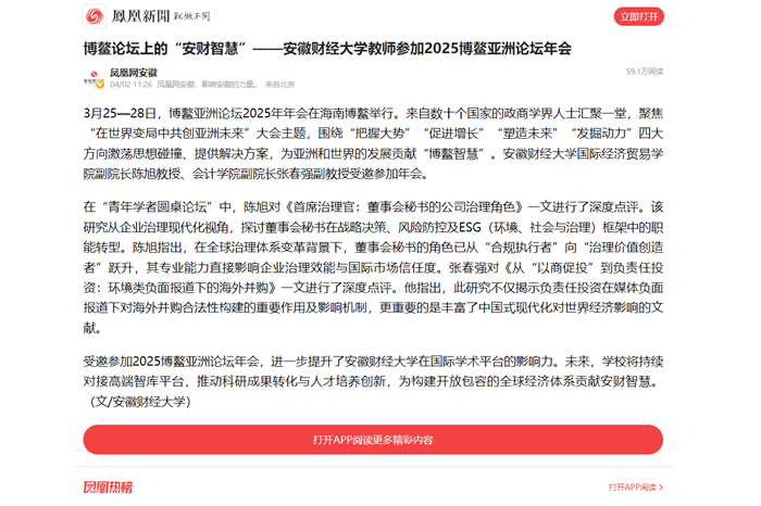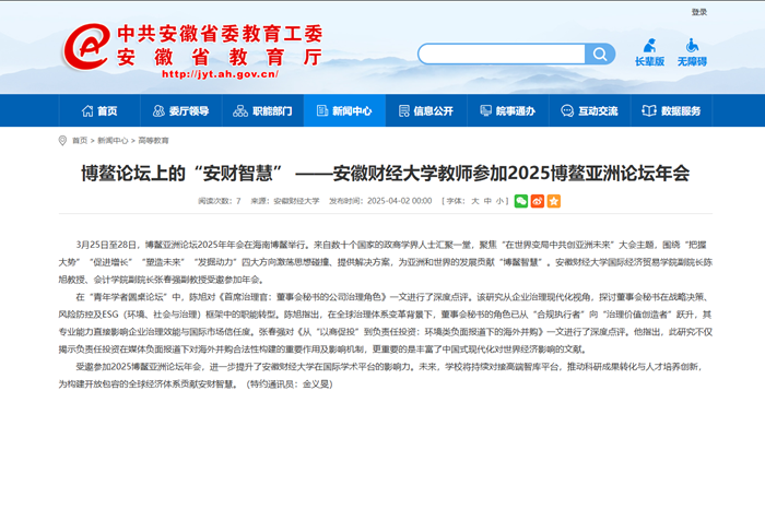 4月2日,凤凰网、安徽教育网以《博鳌论坛上的“安财智慧”——乐竞在线注册教师参加2025博鳌亚洲论坛年会》为题,报道我校国际经济贸易学院副院长陈旭教授、会计学院副院长张春强副教授受邀参加本次年会。