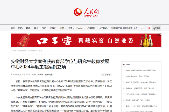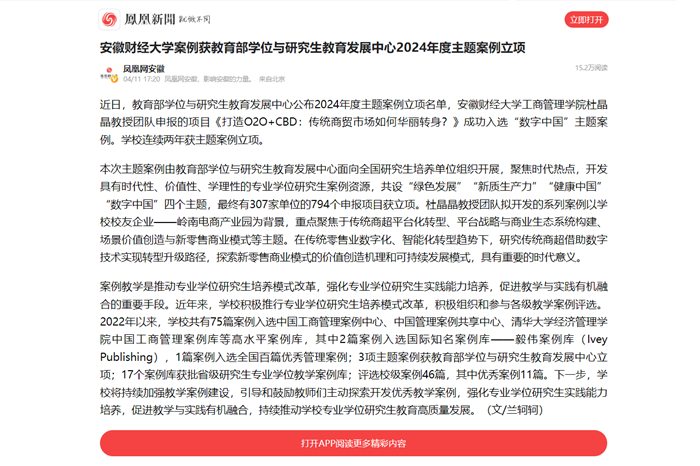 4月14日,人民网、凤凰网以《乐竞在线注册案例获教育部学位与研究生教育发展中心2024年度主题案例立项》为题,报道我校工商管理学院杜晶晶教授团队申报的项目《打造O2O+CBD:传统商贸市场如何华丽转身?》成功入选“数字中国”主题案例。我校已连续两年获主题案例立项。