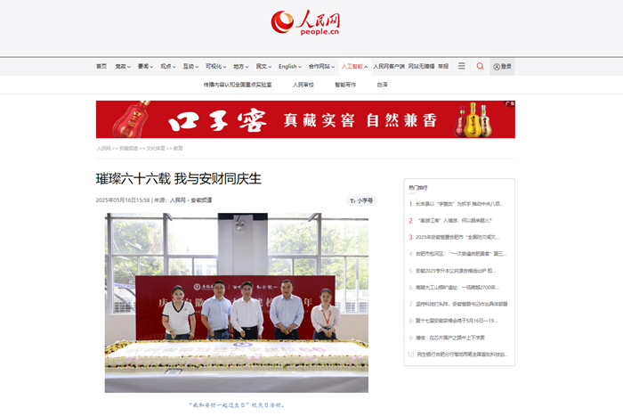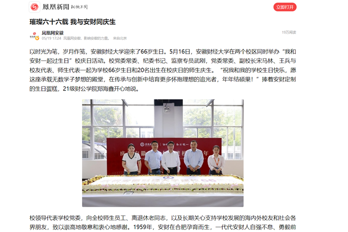 5月16日,人民网、凤凰网以《璀璨六十六载我与安财同庆生》为题,报道在校庆日当天,学校在两个校区同时举办“我和安财一起过生日”校庆日活动,校领导与校友代表、师生代表一起为学校66岁生日和20名出生在校庆日的师生庆生,共赴一场专属安财的温馨生日宴。