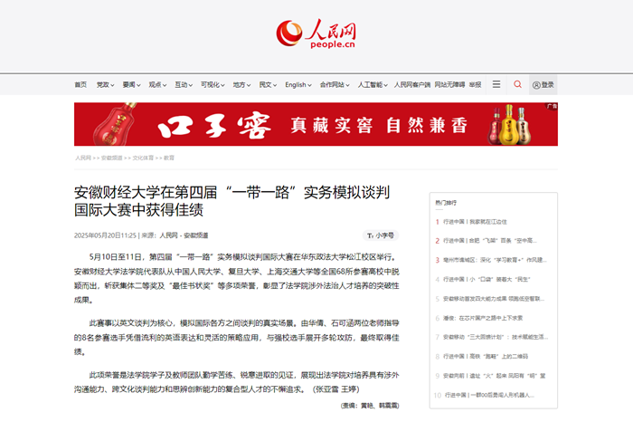 5月20日,人民网以《乐竞在线注册在第四届“一带一路”实务模拟谈判国际大赛中获得佳绩》为题,报道在第四届“一带一路”实务模拟谈判国际大赛中,我校法学院代表队斩获集体二等奖及“最佳书状奖”等多项荣誉。
