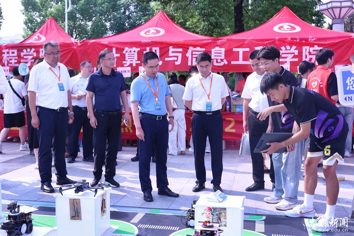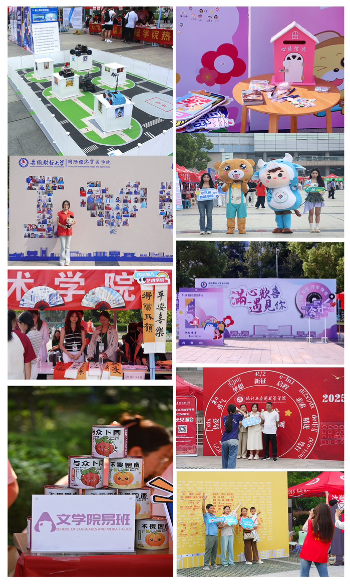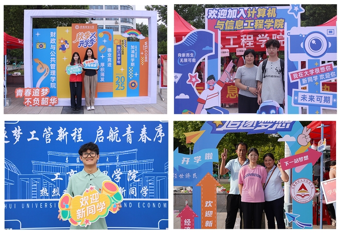 印有新生名字和录取通知书征集的打卡墙、师兄师姐亲手DIY卡套、学科竞赛展台智能车展演等,让新生们直呼“太贴心了”。计算机与信息工程学院的智能车展台持续“吸睛”,科技感满满的动态展演,让新生直观触摸到专业前沿。金融学院、会计学院同步开启“时光明信片”活动,新生写下对未来的憧憬与承诺,以笔墨定格初心;艺术学院老师现场挥毫,“不负韶华”“壮志凌云”等苍劲书法,为新生送上饱含期许的开学礼;法学院、工商管理学院精心打造新生姓名墙、照片墙,用专属仪式感迎接新生加入。经济学院、国际经济贸易学院、管理科学与工程学院、财政与公共管理学院、统计与应用数学学院均设置创意打卡与签名区域;文学院、马克思主义学院等设立了党员先锋岗,组建志愿者队伍,全程提供咨询、引路等暖心服务。