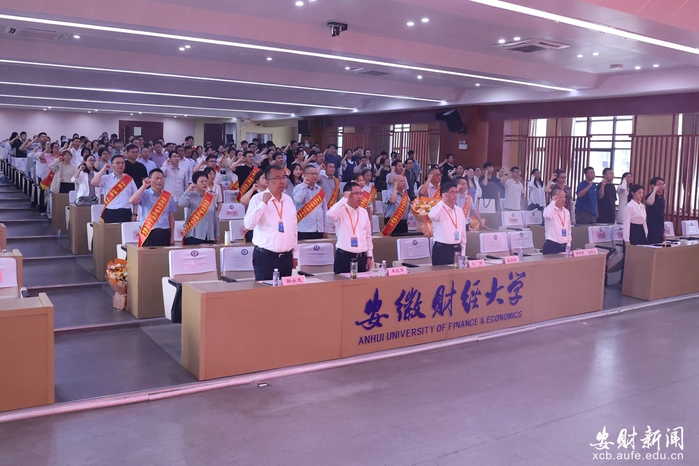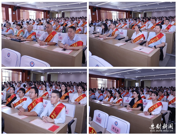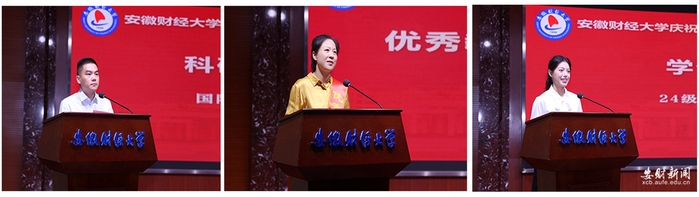 优秀教育工作者代表沈蓉分享了从事管理服务工作以来的心得体会,表示将牢记教育家精神,在平凡岗位上奋斗奉献,以实际行动践行“劳动育人”的责任担当。科研标兵代表郭卫军向大家分享了自己积极响应学校发展战略、深耕科学研究、潜心教书育人的实践与感悟,带领大家重温了人民教师誓词。学生代表、会计学院24级本科生臧君瑶感念学校和恩师培养,表示将把安财精神铭记于胸、付诸于行,以青春之我助力中华民族伟大复兴。