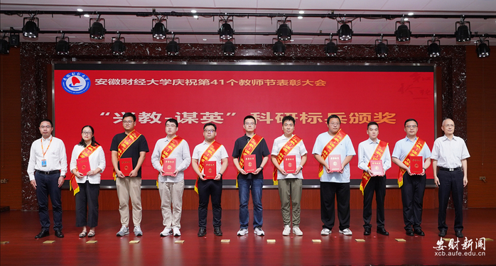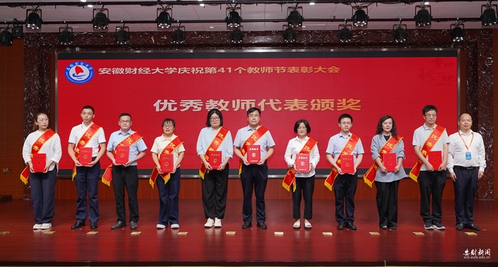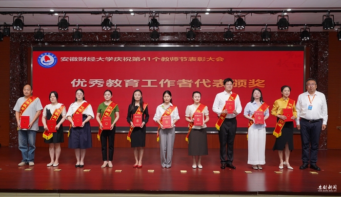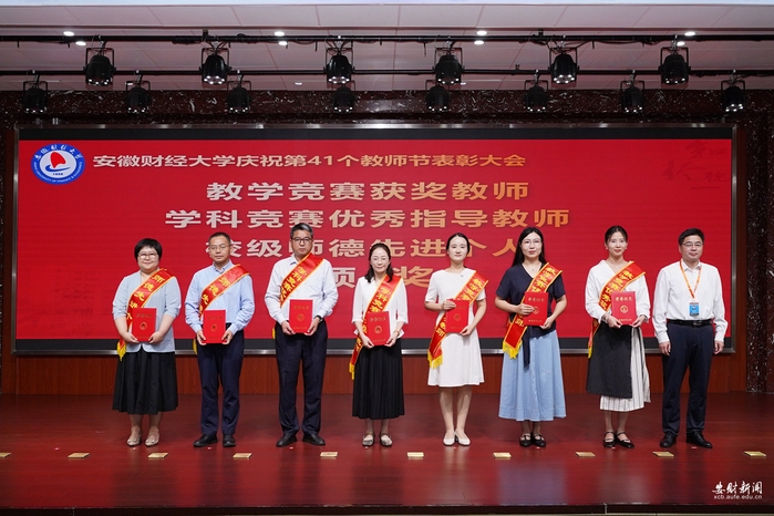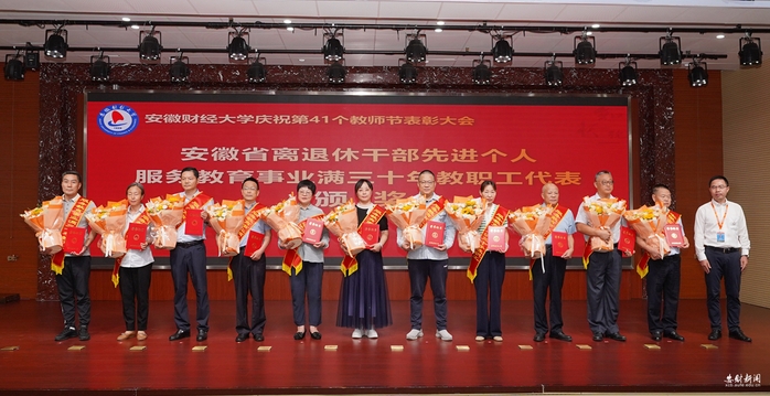 大会向“兴教-谋英”科研标兵、优秀教育工作者、优秀教师、服务教育事业满三十年教职工、全国高校教师教学创新大赛获奖教师、安徽省高校青年教师教学竞赛获奖教师、全国高校混合式教学设计创新大赛获奖教师、全国大学生电子商务“创新、创意及创业”挑战赛国赛优秀指导教师、安徽省离退休干部先进个人、校级师德先进个人等代表进行了表彰。